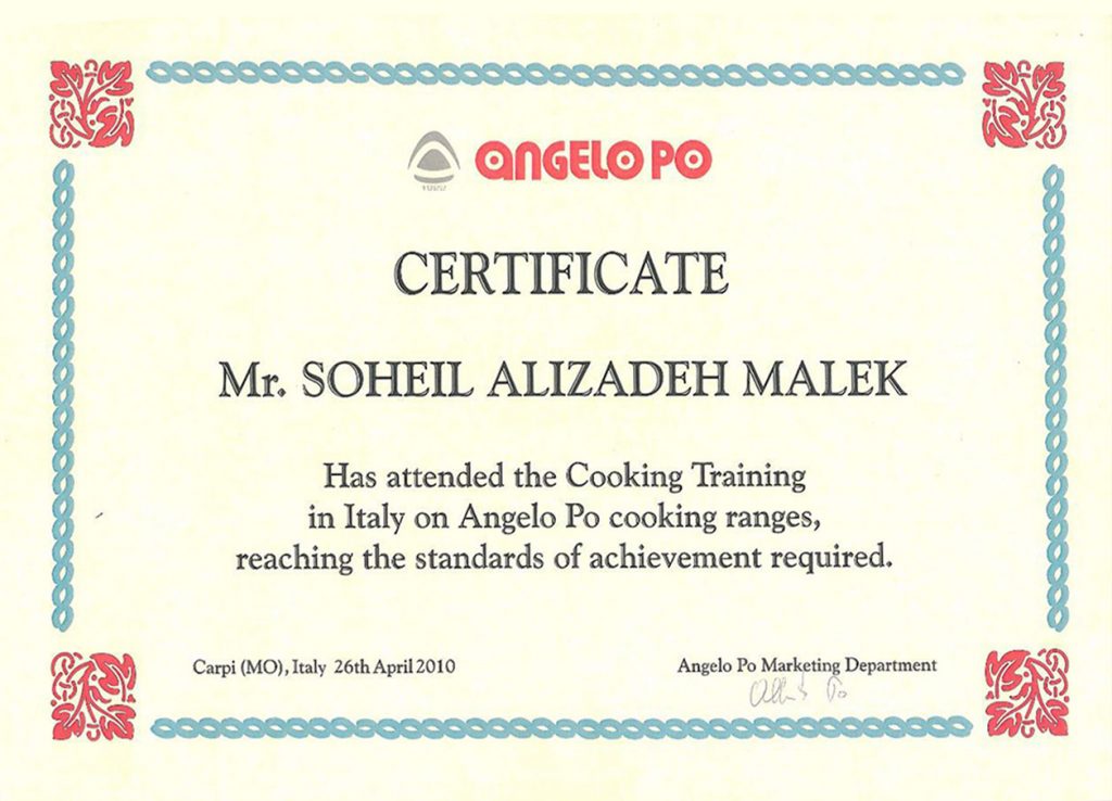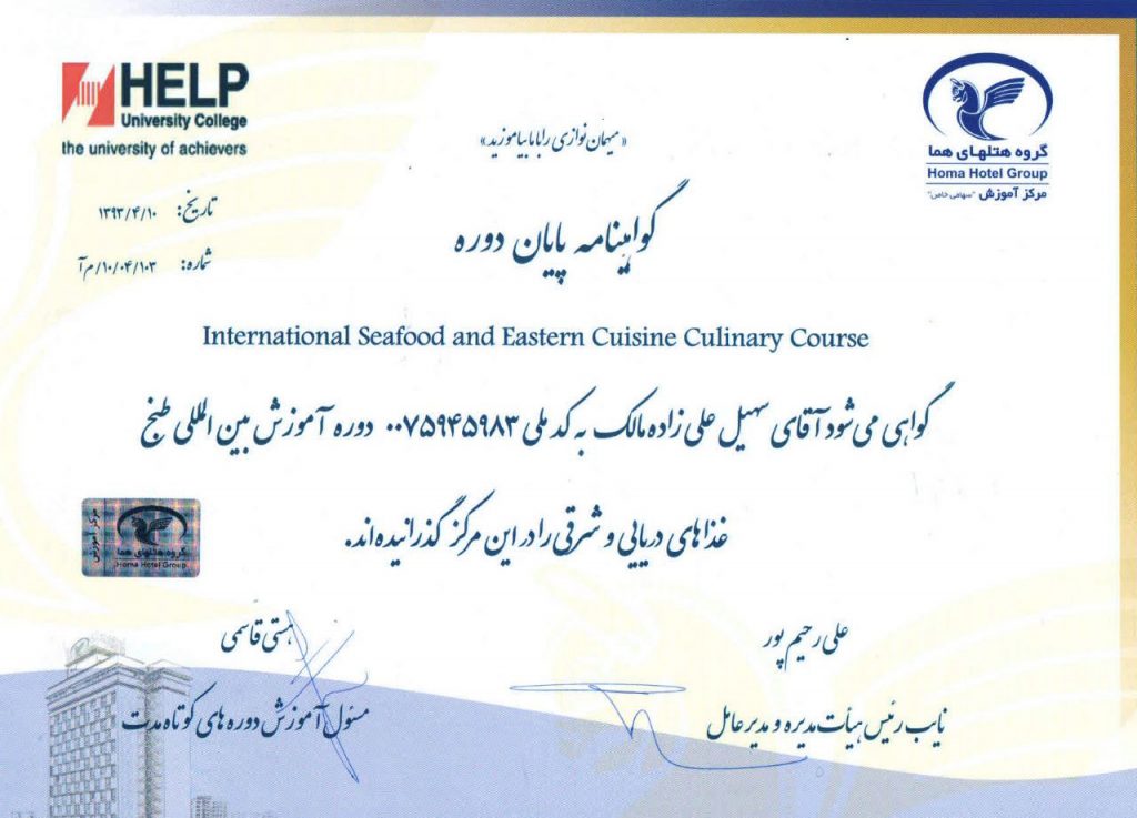 گواهینامه بین المللی گذراندن دوره آشپزی دریایی – ایران – اردیبهشت 1393
