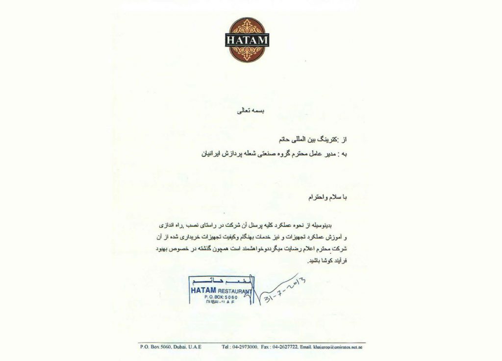 گواهی حسن انجام کار بزرگترین کترینگ خاورمیانه – کترینگ حاتم – دبی